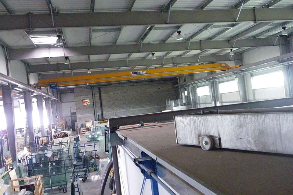 Miroiterie Righetti采用不同型号的安博起重机来吊运玻璃制品和玻璃板。他们使用了三台起重量为3.2吨、跨度为19.6米的ELK型单梁桥式起重机,单梁起重机是中小负载范围内最常用的起重机之一。有利的尺寸可同时保证最高的吊钩位置和最小的小车净空尺寸。在工厂二层,Miroiterie Righetti公司使用了一台LS型立柱式旋臂起重机和一套EHB-X型HB轻型悬挂系统用于物流。立柱式旋臂起重机的安全起重量为400公斤,臂长5米。当负载需要通过平稳运行的悬臂实现有效且精确地移动时,270度的回转半径使立柱式旋臂起重机成为较低负载范围内理想的工位起重机。起重量为1吨的HB轻型悬挂系统也被设计用于起吊低范围负载。负载在生产车间内沿15米长的轨道移动。EHB-X型起重机的特点是安装高度极低。起重机本身是直立式的,即并非在起重机轨道下方运行,而是运行于轨道之间,从而最大限度地利用工厂的现有高度。