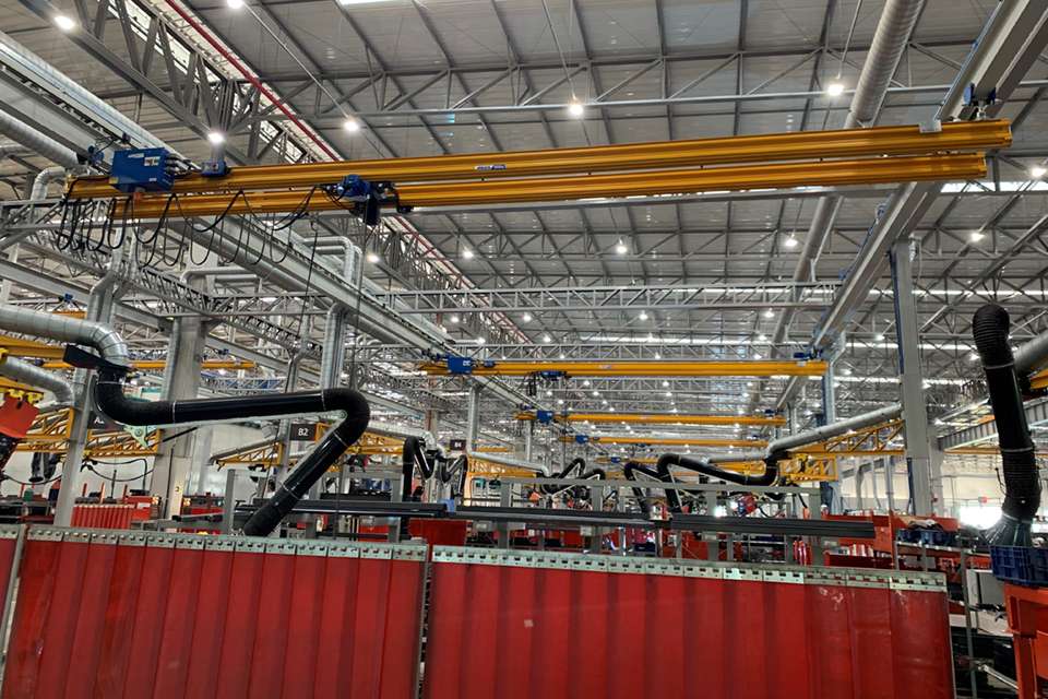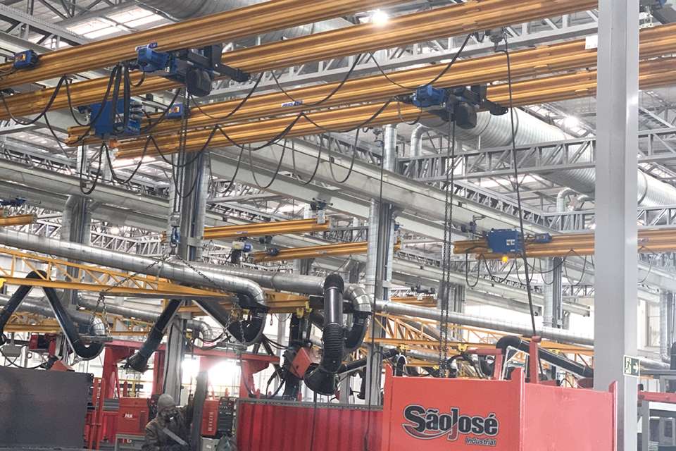 该解决方案共提供了6台单梁桥式起重机:其中两台桥式起重机配备了额定工作载荷为3200公斤的电动钢丝绳葫芦,并且可以协同工作(这意味着一个用户可以同时操作两台桥式起重机)。另外两台起重机也可以协同操作,且具有更高的负载能力:两台电动钢丝绳葫芦都可以提升重达6,300公斤的负载。在搬运较大货物的上层运输层,另有两台负载能力为3200公斤的单梁桥式起重机。然而,最后的两台起重机只能单独工作,即它们不能协同工作。内部物料流是通过安装20个负载能力在250公斤到2000公斤之间的HB轻型悬挂系统来完成的。模块化轻型悬挂式系统用于São José工业生产线上较小零部件的运输和安装。就此,生产过程中一条完整的生产线已建立。一台额定载荷为250公斤的立柱式旋臂起重机用于一个独立的安装工作站。多种安博起重机根据客户所需的负载能力和起重机操作地点进行了组合,因此实现了客户创建动态生产过程的目标和要求。